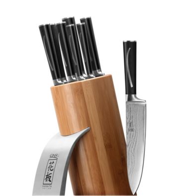 Knives. Web exclusive! Equip your kitchen with the world's best cutlery with this nine-piece set, featuring an assortment of commercial-quality knives made by the masters at Ginsu. 9pc. cutlery set includes: 8" chef's knife, 7" santoku knife, 6.5" cleaver, 6" boning knife, 5" utility knife, 5" santoku knife, 3.5" paring knife, 10" honing rod and a sleek, bamboo block Blades have 33 layers of stainless steel forged together and sharpened to a razor-sharp edge, then cryogenically cooled for sharp edge retention Comfortable POM handles with the Japanese "Hanaita" symbol on the stainless steel end cap Sleek bamboo storage block with brushed metal stand protects the elegant cutlery when its not in use Limited lifetime warranty Imported